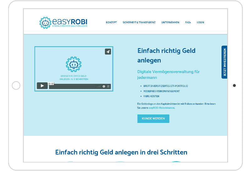 easyROBI ist ein RoboAdvisor und erleichtert Kunden den einfachen, digitalen Abschluss von Vermögensverwaltungsverträgen. Versicherungs- und Fondsvermittler können easyROBI bei ihren Kunden einsetzen und dafür eine attraktive laufende Vergütung erhalten.