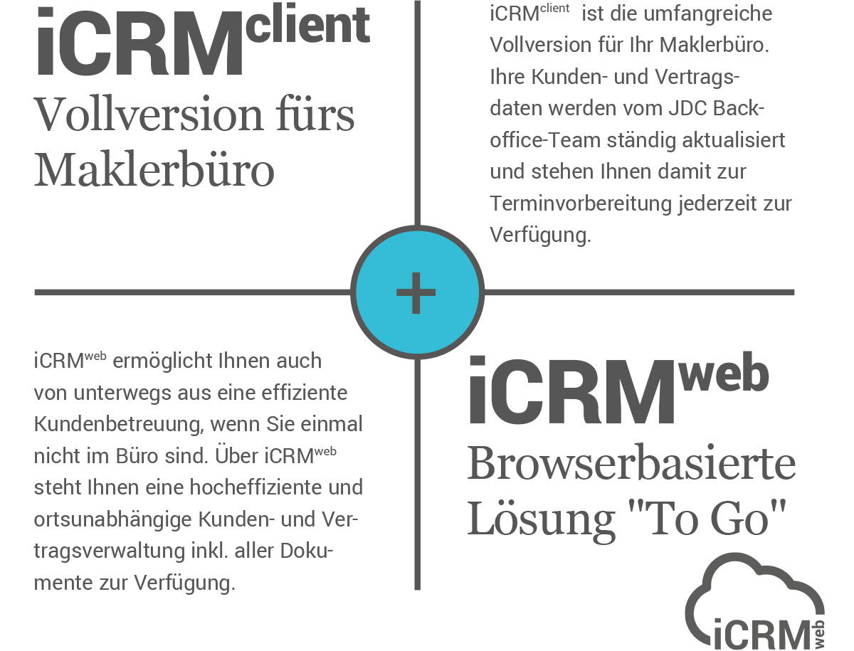 Mit iCRM stellt Jung, DMS & Cie. seinen Vertriebspartnern eine vollständige, umfassende Kunden- und Vertragsverwaltung zur Verfügung. Mit iCRM können Sie sich ein eigenes, teures CRM-System und den mit der Pflege verbundenen Aufwand sparen.